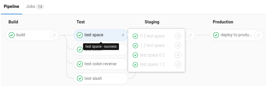 If you have many similar jobs, your pipeline graph becomes very long and hard to read. For that reason, similar jobs can automatically be grouped together. If the job names are formatted in certain ways, they will be collapsed into a single group in regular pipeline graphs (not the mini graphs). You'll know when a pipeline has grouped jobs if you don't see the retry or cancel button inside them. Hovering over them will show the number of grouped jobs. Click to expand them.